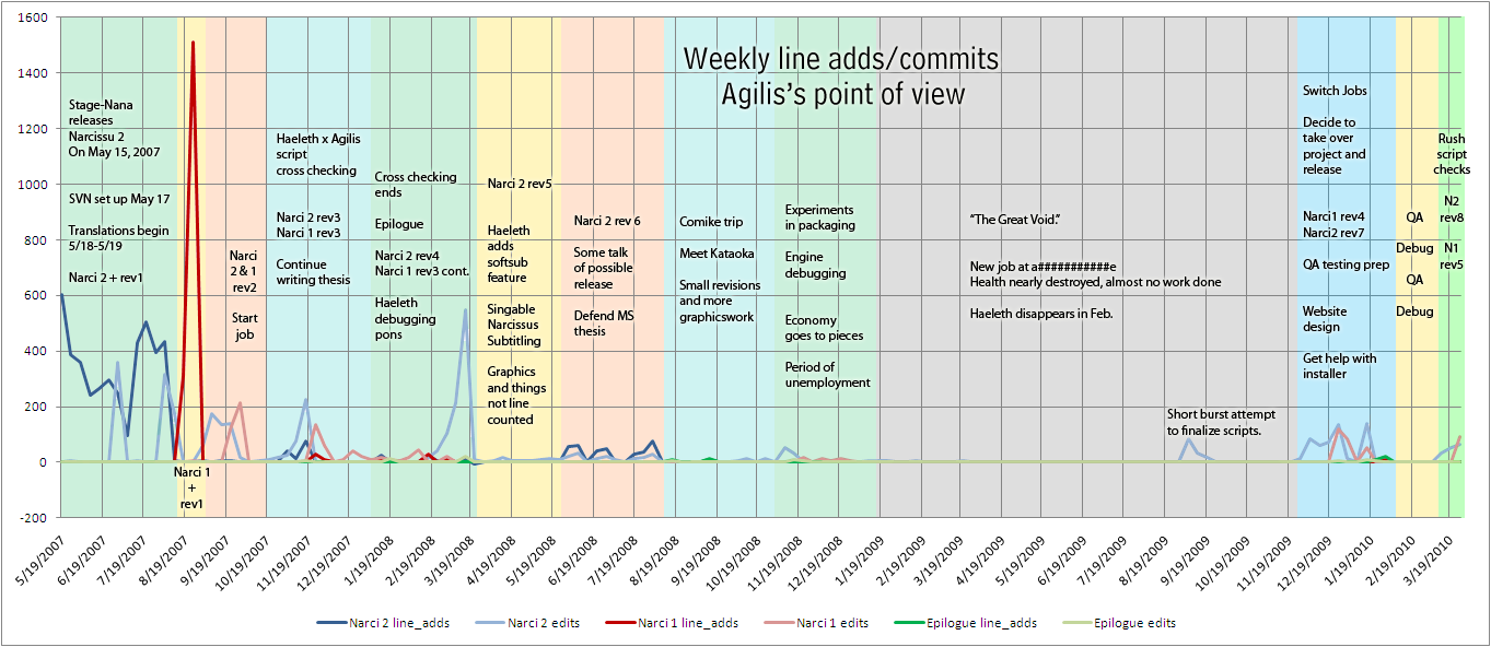 Hopefully, this timeline throws some color onto what happened “behind the scenes” during the project. Yes I made 8 full top-to-bottom revisions of the Narcissu 2 script, and 5 of Narcissu 1. Did I need so many? Of course not. I probably could have done with 3-4, but I was also waiting for someone else (who never really did reappear).